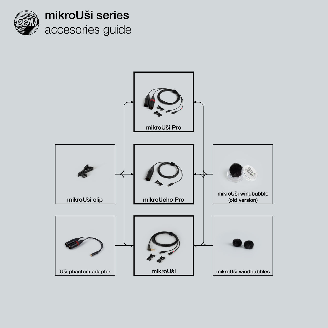 mikroUši Pro /mikrouʃɪ:/ are a pair of phantom-powered stereo-matched, high quality omni-directional electret microphones. Compared with regular built-in microphones supplied with many recorders, mikroUši Pro have exceptionally low noise and high sensitivity, in addition to their tiny size (only 6.8 mm in diameter). They are especially useful for recording delicate sounds and environments.